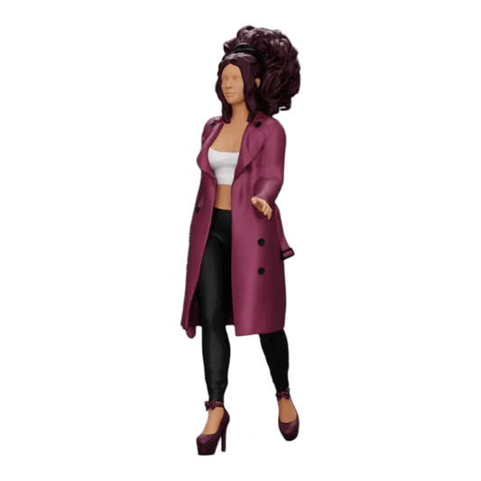 Miniatuurfiguur: Modieuze vrouw met krullend haar in lange, open mantel wandelt (Nr. a40)